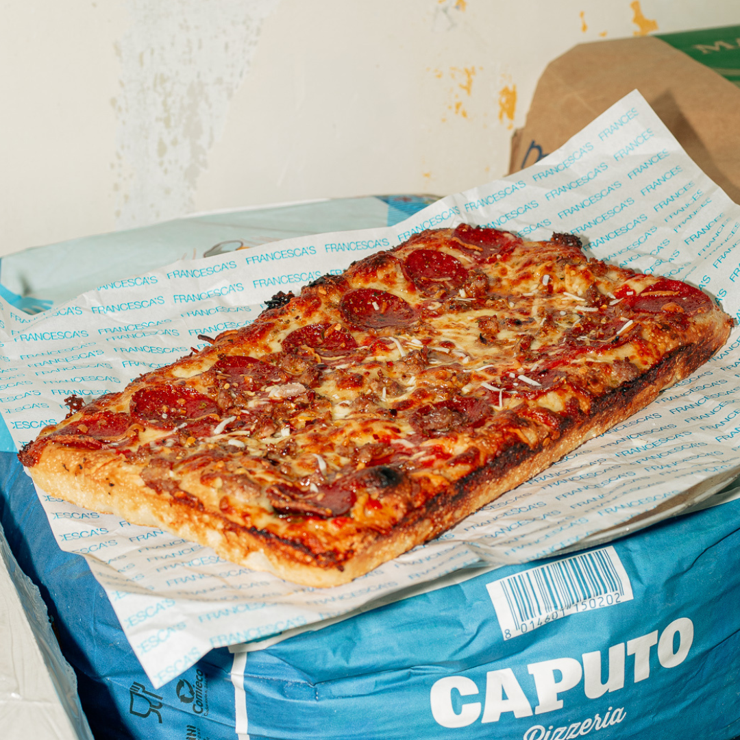 Italian sausage, pepperoni, Francesca’s Sicilian sauce, dry aged mozzarella, pecorino romano, garlic oil, oregano and chilli flakes.